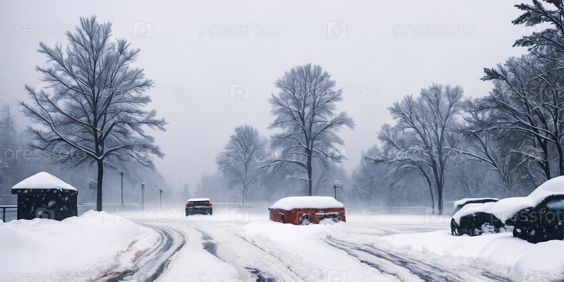 Последствия сильной метели, когда снежные заносы засыпали строения и дороги, создавая зимний пейзаж, окутанный белым покрывалом. Панорама