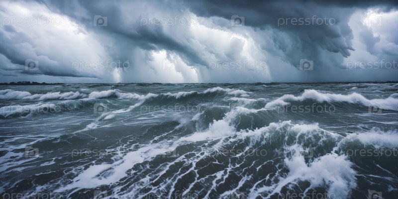 Мощь разрушительного урагана, запечатлевшего огромный штормовой нагон, затопляющий прибрежные районы, демонстрирующий неумолимую силу гнева природы. Панорама