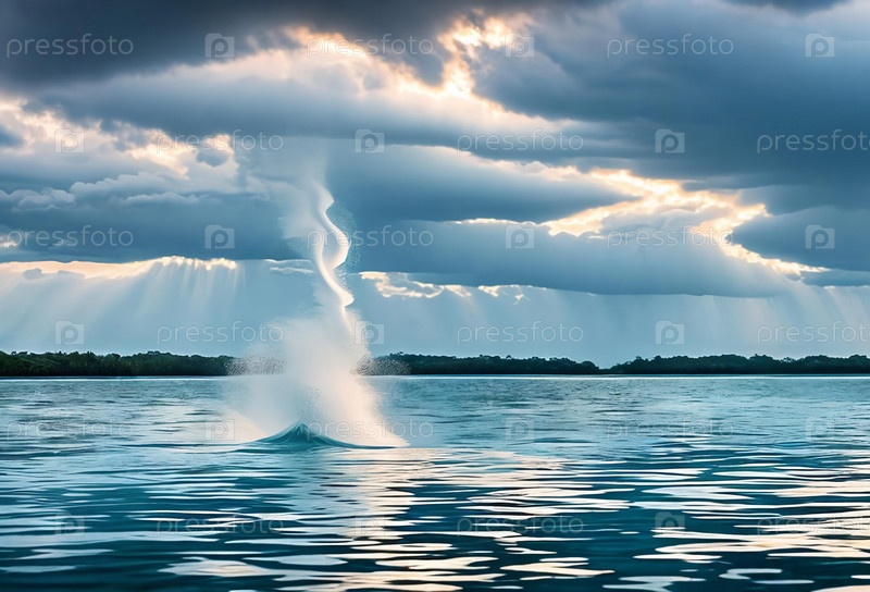 Завораживающий спиральный узор водяного смерча, формирующегося над водоемом, подчеркивающий неземную красоту этого природного явления, прежде чем оно рассеется. Панорама