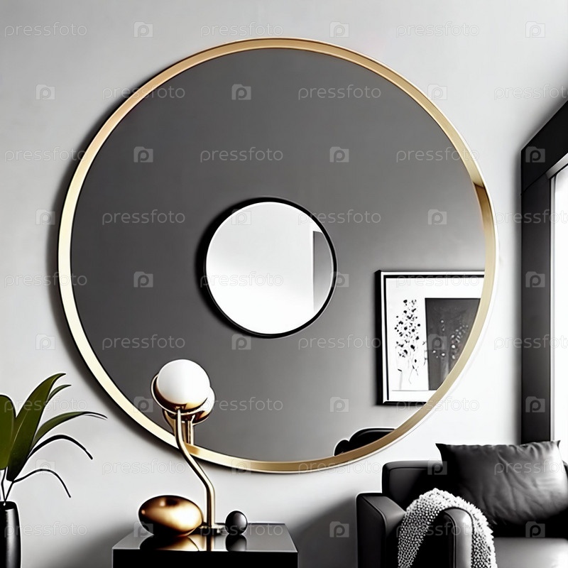 Крупный план стильного круглого настенного зеркала, отражающего современный декор гостиной. Чистые линии и современная эстетика, демонстрирующие универсальность и изысканность дизайна интерьера