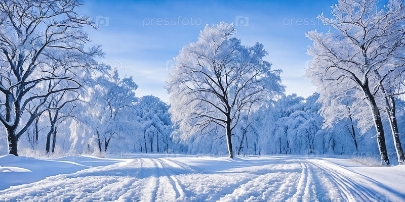 Спокойный зимний пейзаж, снег покрывает землю, деревья украшены инеем, живописная панорама. Генеративный ИИ