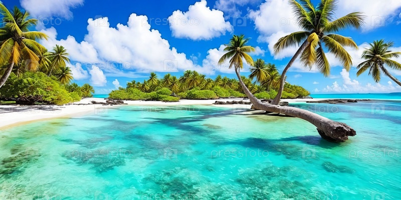 Спокойное море тянется вдоль длинного белого пляжа, где изящно изогнутая пальма покачивается на ветру