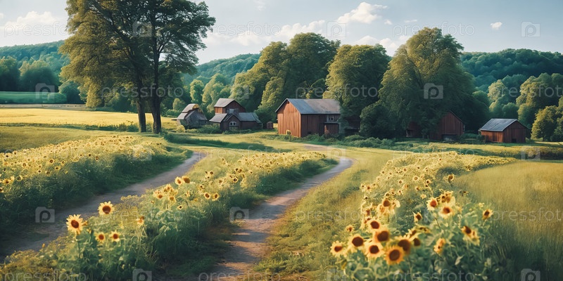 Очаровательный деревенский дом, расположившийся под высокими деревьями, вдоль извилистой полевой дороги, обрамленной яркими подсолнухами. Спокойная и живописная обстановка. Генеративный ИИ