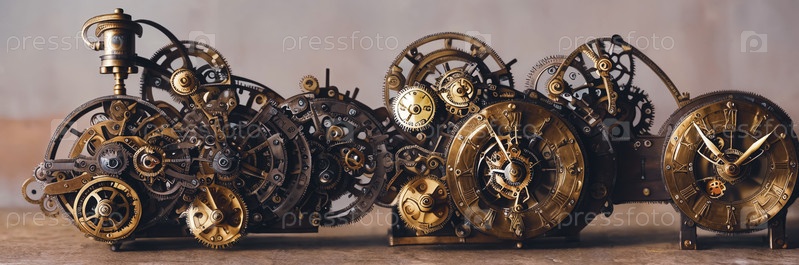Стимпанк-часовой механизм: сложный механизм, сочетающий в себе шестеренки, зубчатые колеса, винтажные латунные элементы, вызывающие в памяти технологии викторианской эпохи. Генеративный ИИ