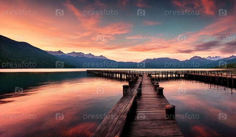 Яркий закат раскрашивает небо над спокойным озером. Генеративный ИИ