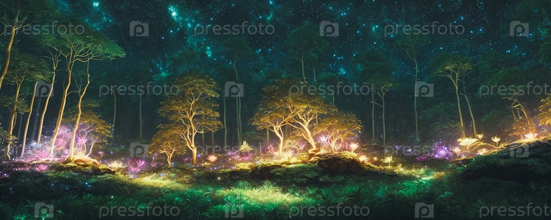 Мистический лес ночью с люминесцентными растениями и существами, похожими на светлячков, освещающими сцену. Создано с помощью ИИ