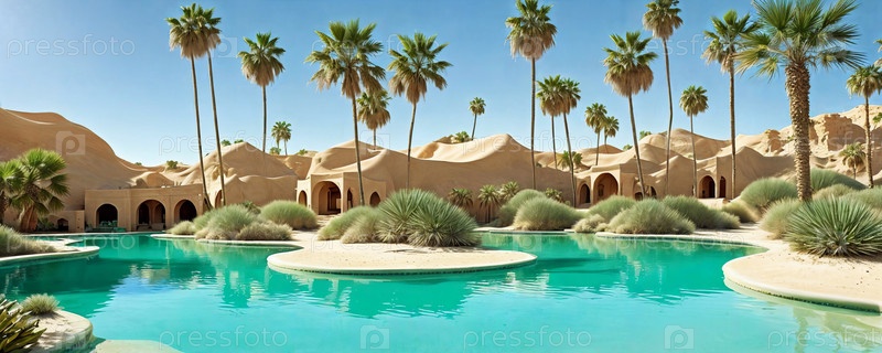 Скрытый оазис в пустыне с изумрудно-зелеными водами, пальмами и волшебными песчаными дюнами, которые меняют форму. Создано с помощью ИИ