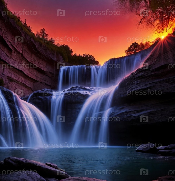 Фантастический красивый пейзаж с водопадом на закате