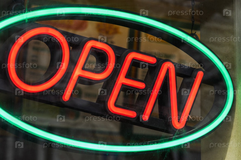 Светящиеся красные и зеленые неоновые вывески «Открыто» устанавливаются на витринах магазинов и указывают часы работы