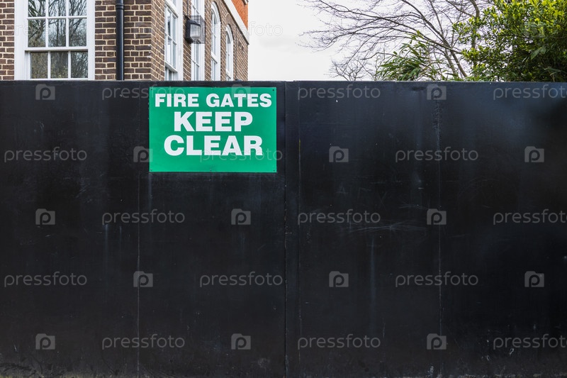 Знак безопасности «Пожарные ворота должны быть свободны» на черных металлических воротах для аварийного доступа и пожарной безопасности