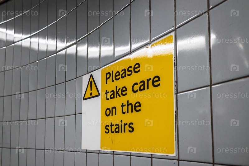 Желтый знак безопасности на кафельной стене, напоминающий людям о необходимости соблюдать осторожность при использовании лестниц в помещении