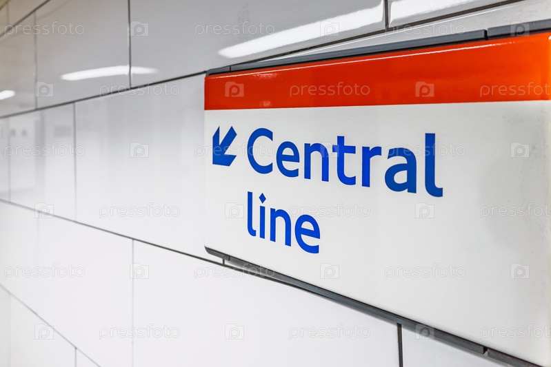 Платформа лондонского метрополитена с надписью Central Line, установленной на чистой белой плитке