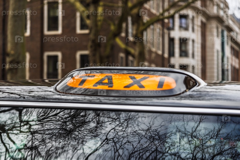 Классическое лондонское такси с подсвеченным желтым знаком такси на фоне городской улицы