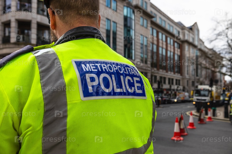 Сотрудник столичной полиции в светоотражающей куртке стоит на улице Лондона во время патрулирования