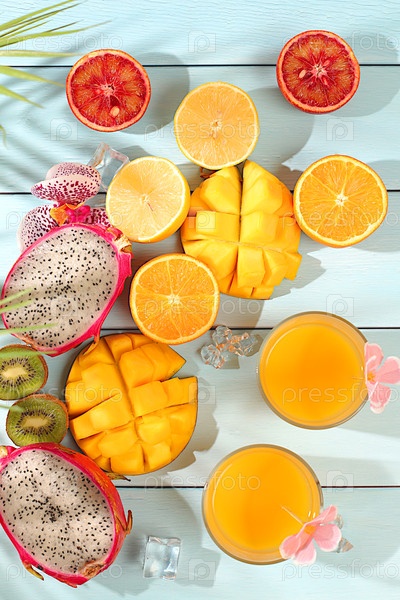 Концепция летней вечеринки. Солнечный тропический флаер, фон с коктейлями и соками из цитрусовых, драконьего фрукта и манго. Экзотические фрукты и цветы орхидеи на ярком фоне. Визитная карточка для бара