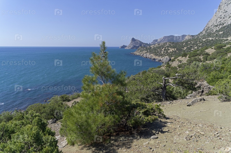 Красивый морской пейзаж. Крым, побережье между Судаком и Новым Светом, вид в сторону Нового Света. Солнечный день в апреле