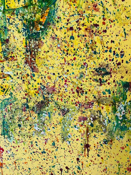 Желтая стена разрисованная разноцветной краской зеленого, пурпурного, бордового, синего цветов