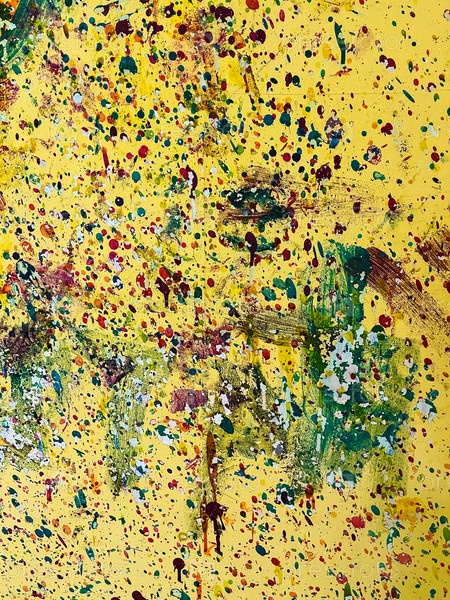 Желтая стена разрисованная разноцветной краской зеленого, бордового, синего, морского цветов