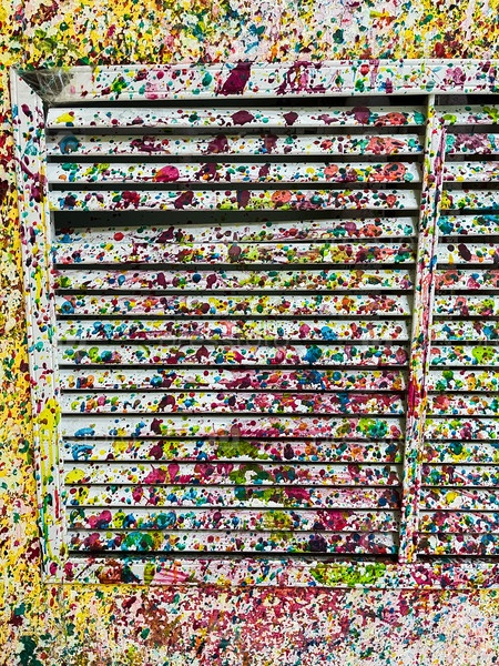 Белая решетка и стена желтого цвета разрисованные разноцветной краской