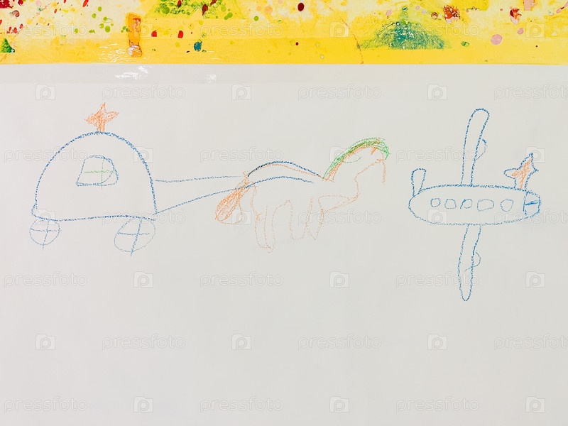 Рисунки синего, оранжевого, зеленого цвета нарисованные на белой бумаге и стене желтого цвета