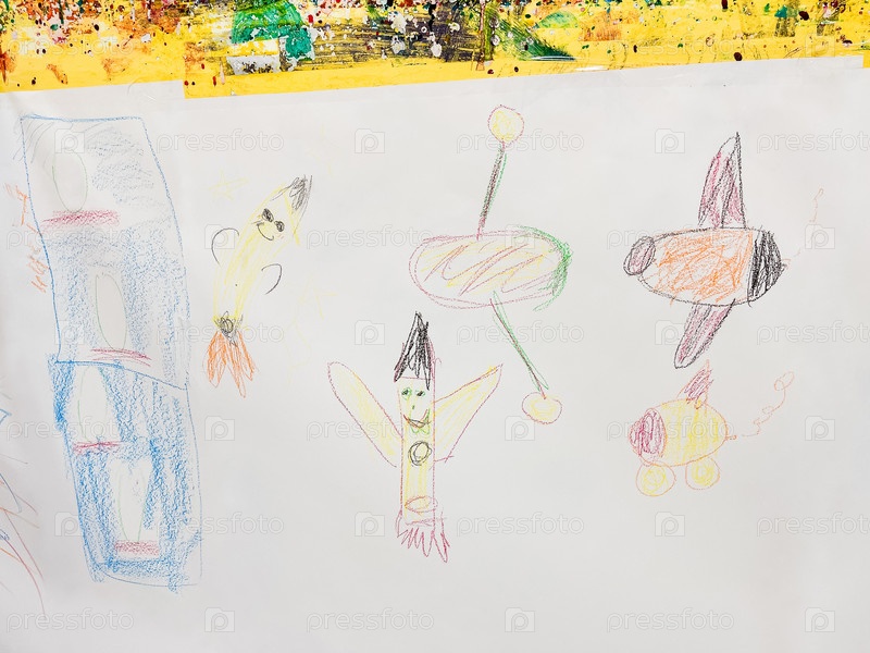 Рисунки синего, оранжевого, пурпурного, зеленого цвета нарисованные на белой бумаге и стене желтого цвета