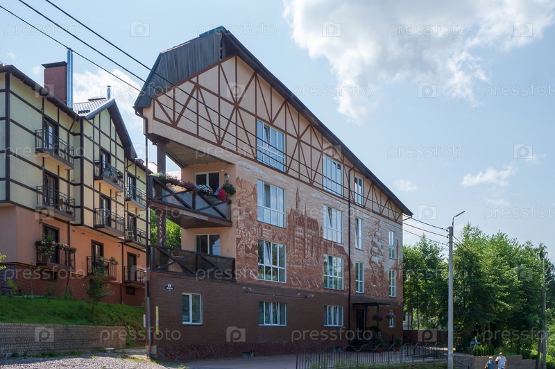 Светлогорск, Россия - 2021, 25 июля: Архитектура города. Городская архитектура. Трехэтажный жилой дом необычной формы