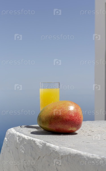 Стакан сока и манго на фоне моря и голубого неба крупным планом
