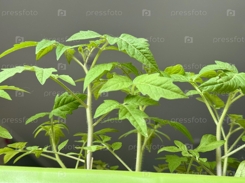 Рассада томатов в пластиковых контейнерах. Подготовка к сезону садоводства. Крытый огород. Съемка с низкого ракурса