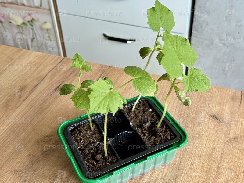 Рассада огурцов в пластиковом контейнере. Подготовка к садовому сезону. Крытый огород