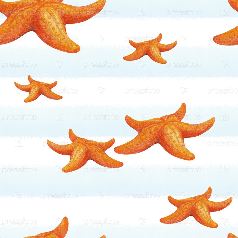 Раппорт летнего бесшовного узора с красной морской звездой на полосатом бело-голубом фоне. Бесконечный паттерн из нарисованных вручную акварельных элементов для постельного белья, ткани, обоев, текстиля или упаковки