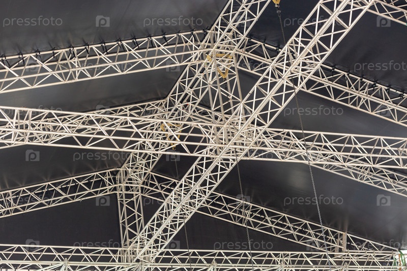 Вид на металлическую ферменную крышу, демонстрирующую ее структурный дизайн и промышленную элегантность. Элементы сборной модульной конструкции крыши для мобильной концертной сцены
