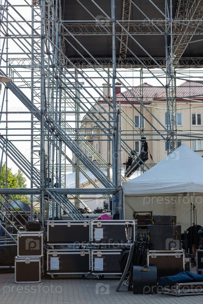 Большая площадь заполнена сложенными ящиками с оборудованием и сценическим оборудованием, которые готовятся к предстоящему событию. Сверху установлены крановые конструкции, готовые к установке
