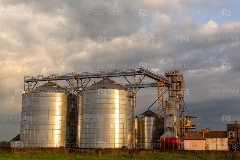 Группа зерносушильных комплексов на драматическом облачном закатном небе. Вид на современное зернохранилище, зерносушильное комплекс, коммерческие зерновые или семенные силосы в солнечном весеннем сельском пейзаже