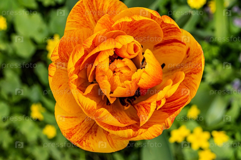 Шикарный весенний цветок полураскрывшегося махрового тюльпана оранжевого цвета. Яркий зеленый фон весенней листвы и травы. вид сверху вблизи. макро