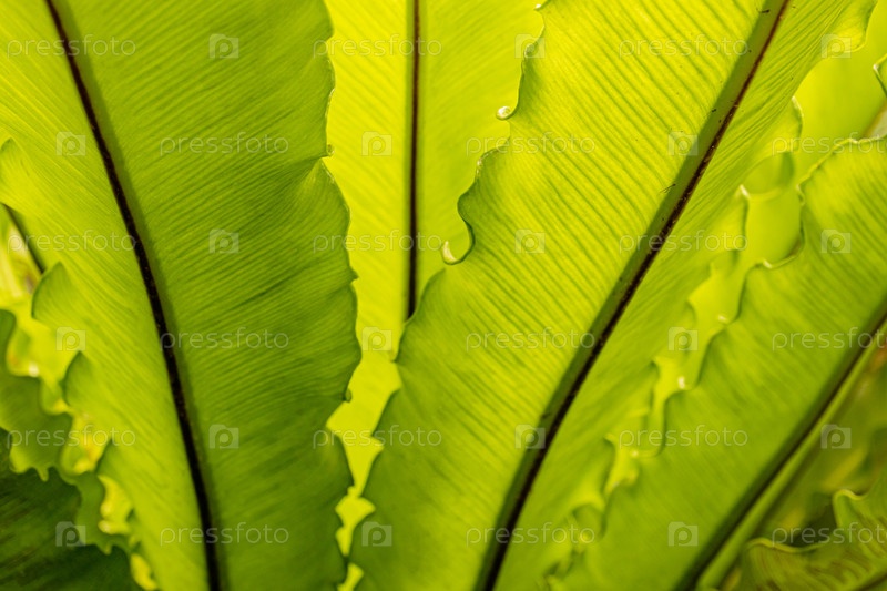 Великолепные листья тропического дерева крупным планом против солнечных лучей. Большая часть листьев бананового дерева. Яркий зеленый фон