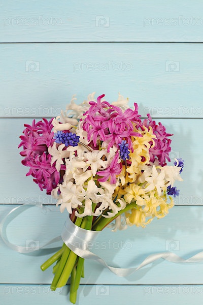 Красивый букет из разных сортов гиацинтов и мускари. Абстрактная цветочная композиция для экрана и шаблон дизайна. Весенняя открытка, визитная карточка для демонстрации продукции, подарок для любимых