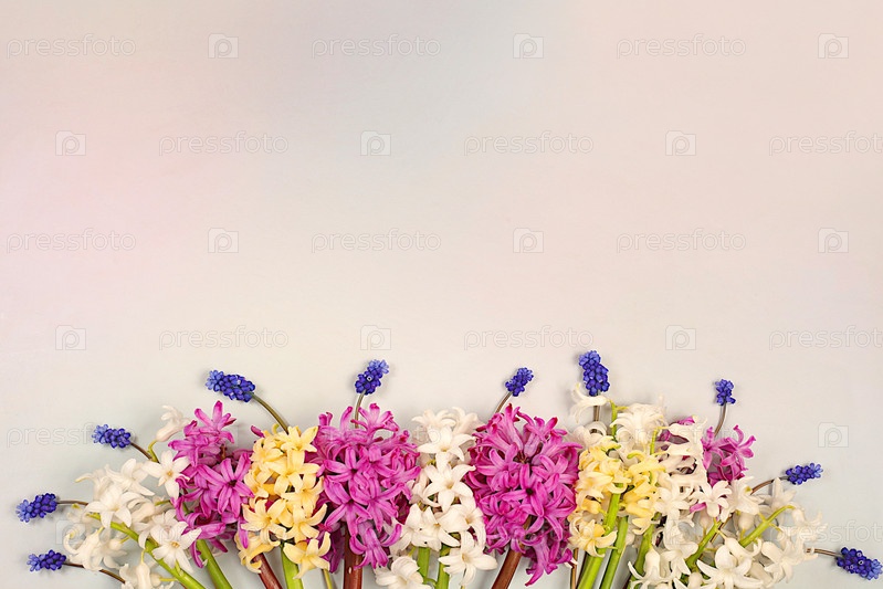 Красивый баннер с различными сортами гиацинтов и мускари. Абстрактная цветочная композиция для экрана и шаблон дизайна с местом для текста. Весенняя открытка, визитная карточка для демонстрации продукта