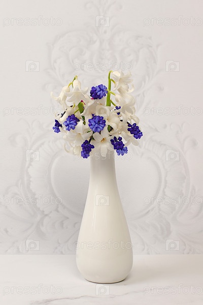 Красивый баннер разных сортов гиацинтов и мускари в вазе, шаблон для дизайна и экрана. Абстрактная цветочная композиция. Весенняя открытка, визитка для демонстрации продукта, подарок для близких
