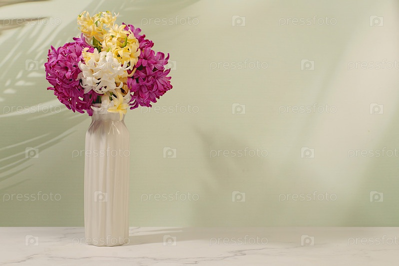 Красивый баннер разных сортов гиацинтов и мускари в вазе, шаблон для дизайна и экрана. Абстрактная цветочная композиция. Весенняя открытка, визитка для демонстрации продукта, подарок для близких