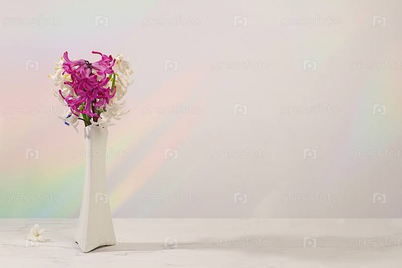 Красивый баннер разных сортов гиацинтов и мускари в вазе, шаблон для дизайна и экрана. Абстрактная цветочная композиция. Весенняя открытка, визитка для демонстрации продукта, подарок для близких