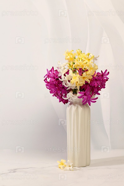Красивый баннер разных сортов гиацинтов и мускари в вазе, шаблон для дизайна и экрана. Абстрактная цветочная композиция. Весенняя открытка, визитка для демонстрации продукта, подарок для близких