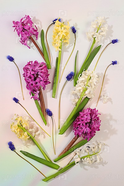 Абстрактная цветочная композиция. Красивый баннер с различными сортами гиацинтов и мускари, шаблон для дизайна и экрана. Весенняя открытка, визитная карточка для демонстрации продукции, подарок для близких