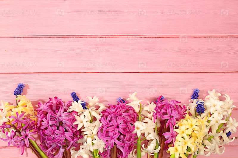Абстрактная цветочная композиция. Красивый баннер с различными сортами гиацинтов и мускари, шаблон для дизайна и экрана. Весенняя открытка, визитная карточка для демонстрации продукции, подарок для близких