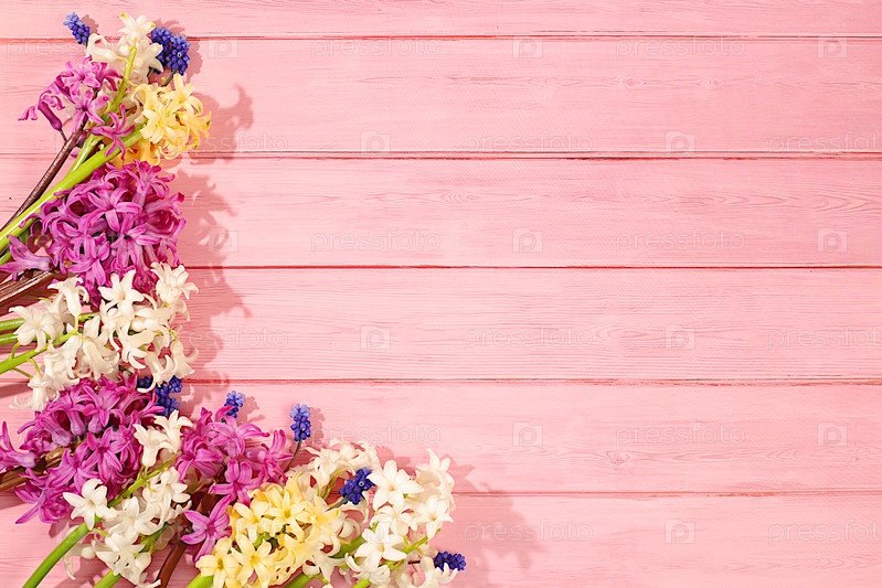 Абстрактная цветочная композиция. Красивый баннер с различными сортами гиацинтов и мускари, шаблон для дизайна и экрана. Весенняя открытка, визитная карточка для демонстрации продукции, подарок для близких