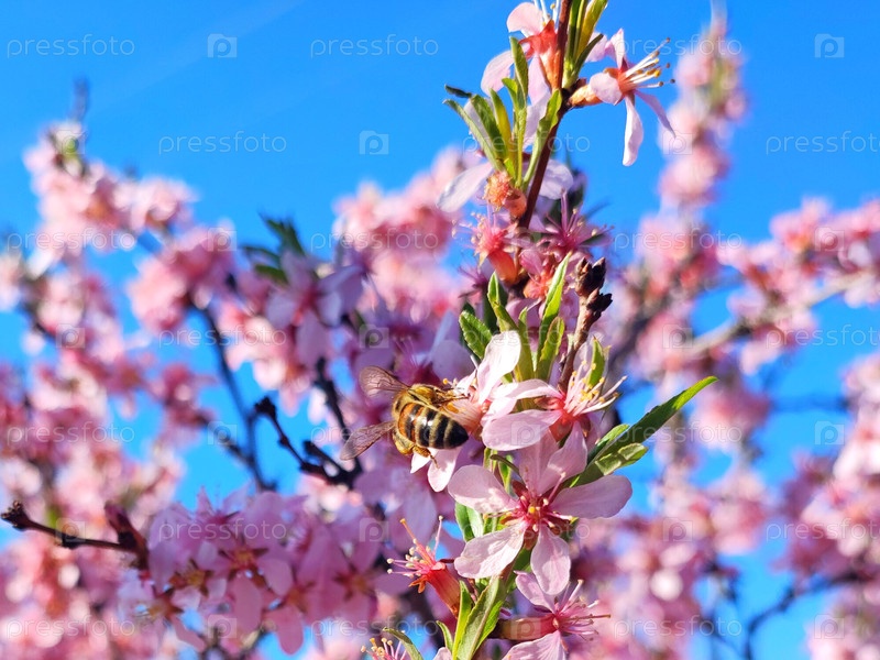 Миндаль цветет в Алтайском крае, Пчела собирает нектар цветка. Розовые цветы. Almonds bloom in the Altai Territory, a bee collects the nectar of the flower. Pink flowers