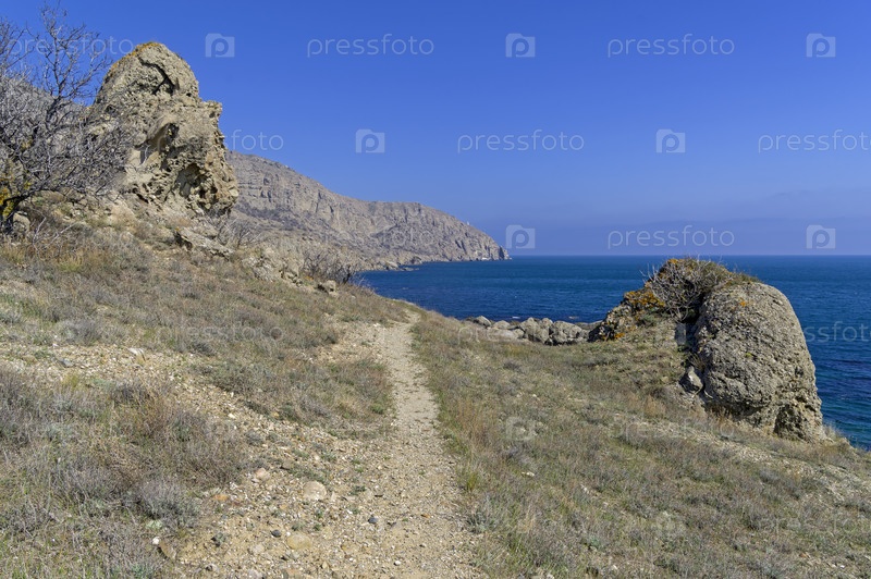 Тропинка, идущая по берегу моря. Слева от тропы - камень, в структуре которого можно увидеть следы окаменевших коралловых отложений. Мыс Меганом, Крым, апрель