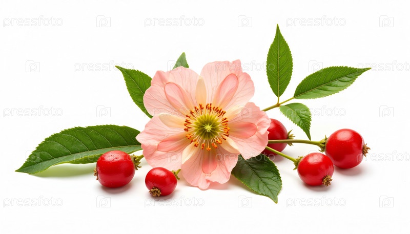 Нежно-розовая дикая роза с ярко-красными плодами шиповника на белом фоне