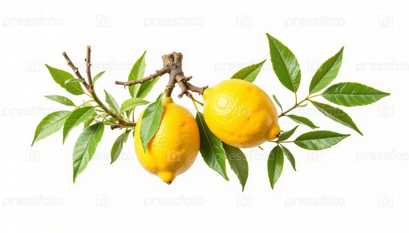 Яркие желтые лимоны на ветке с зелеными листьями на белом фоне
