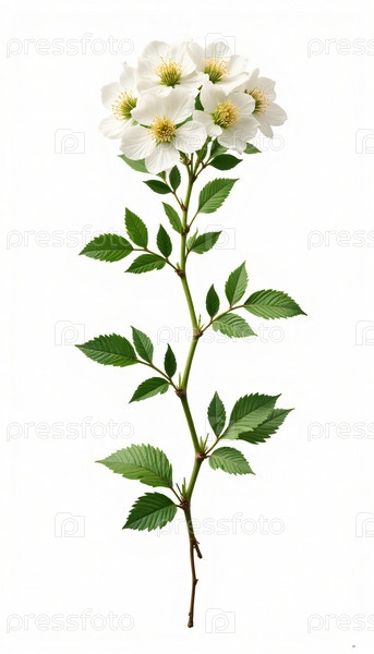 Нежная белая ветка жасмина с многочисленными цветами на белом фоне