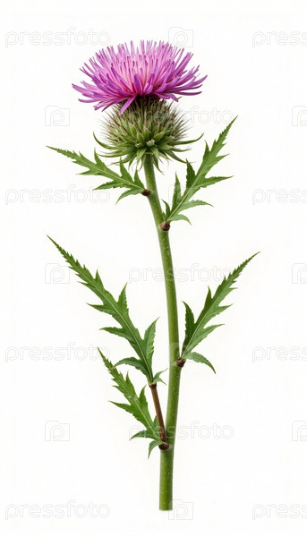 Колючий фиолетовый цветок чертополоха с острыми листьями на белом фоне